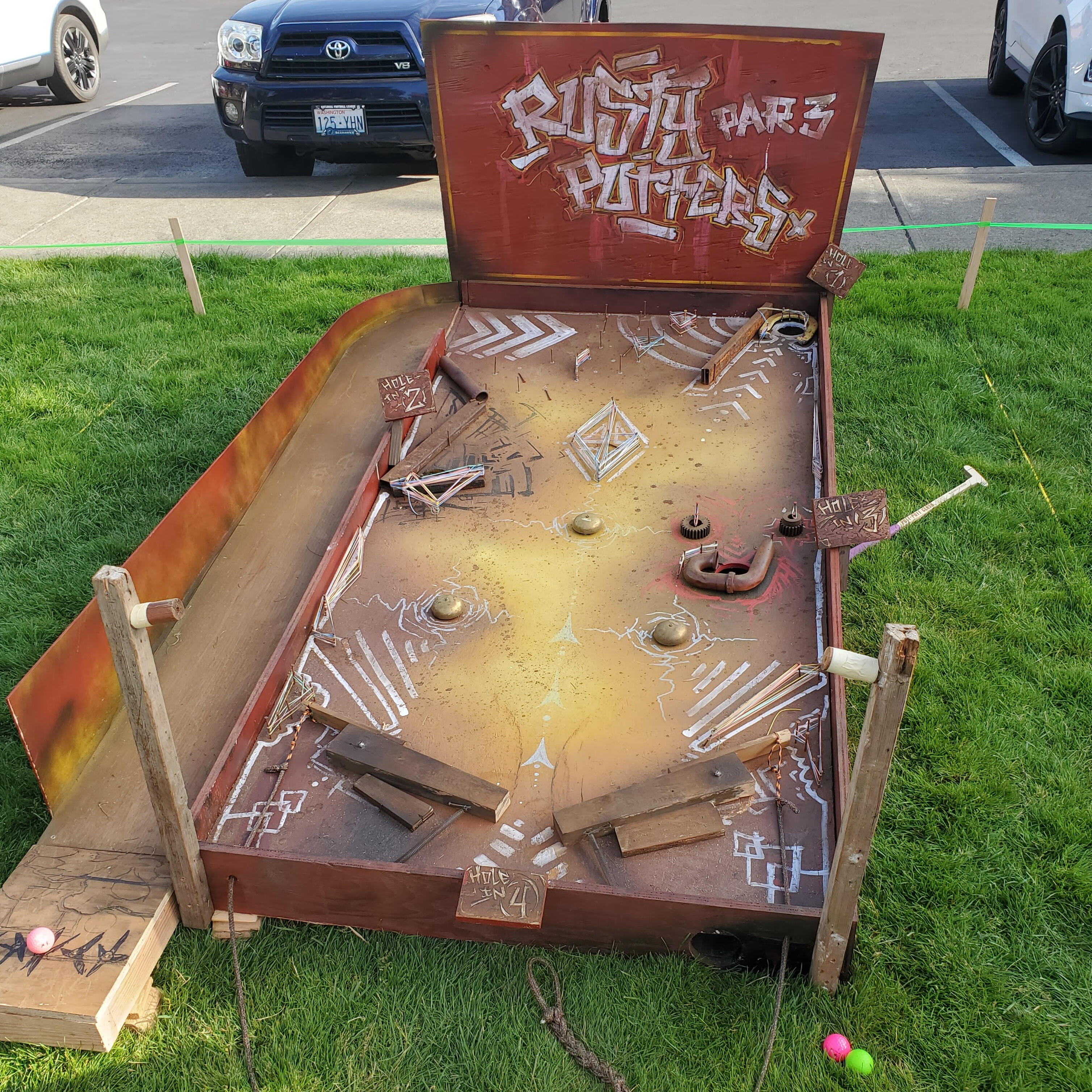 Open play is from Noon to 7:30pm.A $10 ticket gets a player a golf ball, putter, score card, and a ballot. Kids under 5 play for free. All ticket sales go into the prize pool to be awarded to the builders for their hard work.After playing each hole, players vote for their favorite! Voting will close at 7:30pm Saturday. After counting the votes, we’ll announce the 1st, 2nd & 3rd place winners - $500, $200, & $100 respectively.